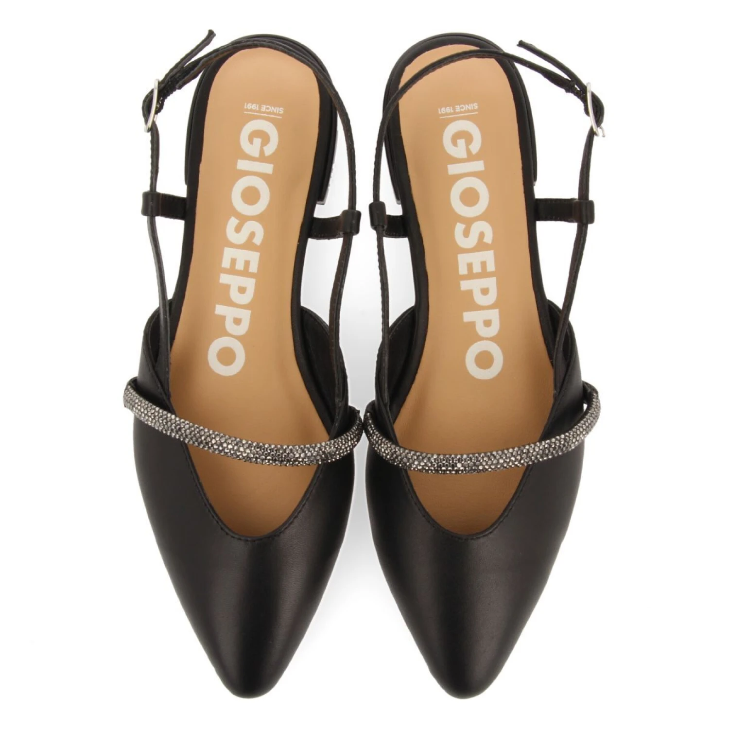 Glänzen Sie wie ein Diamant! Schwarze Lederballerinas ohne Absatz mit Knöchelverschluss mit Schnalle für optimalen Halt. Sie sind mit einem Strassband verziert. Das Innenfutter ist aus Leder. Sehr bequeme, gepolsterte Einlegesohle aus Leder, das in einem nachhaltigeren Gerbverfahren nach den Standards der Leather Working Group gegerbt wurde. Flexible Sohle. Entdecken Sie die neue SS24 Ballerina-Kollektion von Gioseppo Woman. Absatzhöhe 1,5 cm.