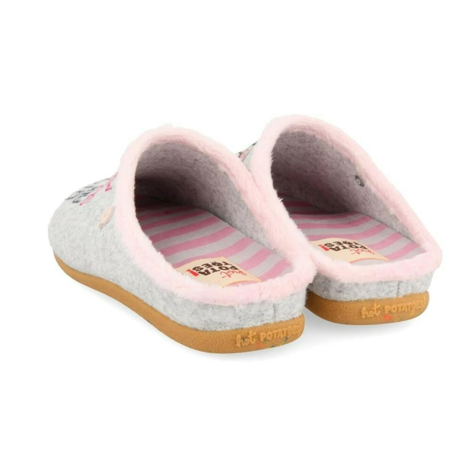 Die bequemsten und wärmsten Kartoffeln sind Hot Potatoes. Graue Hausschuhe vom Typ Babouche, gemusterter Schnitt aus recyceltem PET-Filz. Einfassung aus weichem Polyestergewebe, und plüschige Pflanze aus weichem Polyestergewebe. Herausnehmbare Einlegesohle aus 100% recyceltem Polyurethan, Sohle aus Naturkautschuk. Die haltbarsten Designs, damit du deine Komfortzone nicht verlässt.