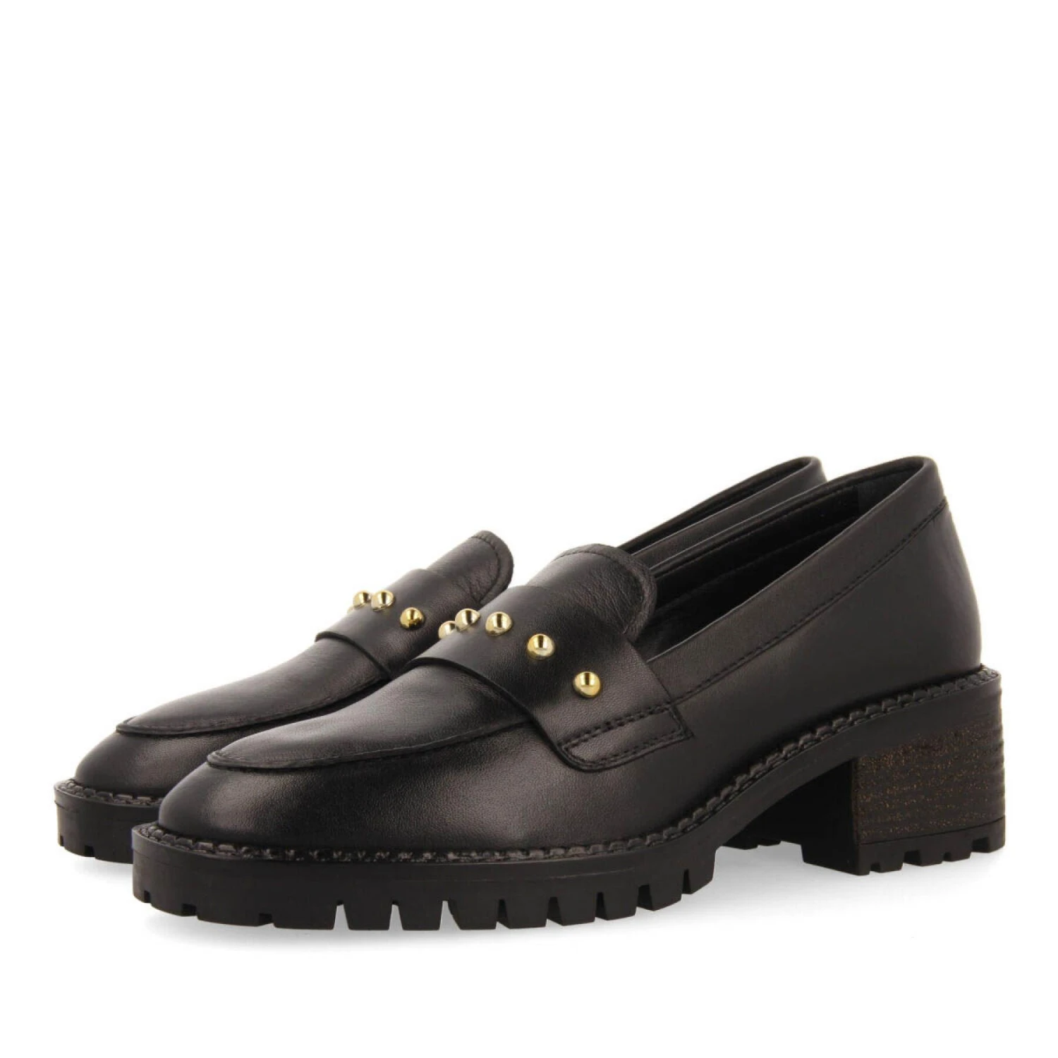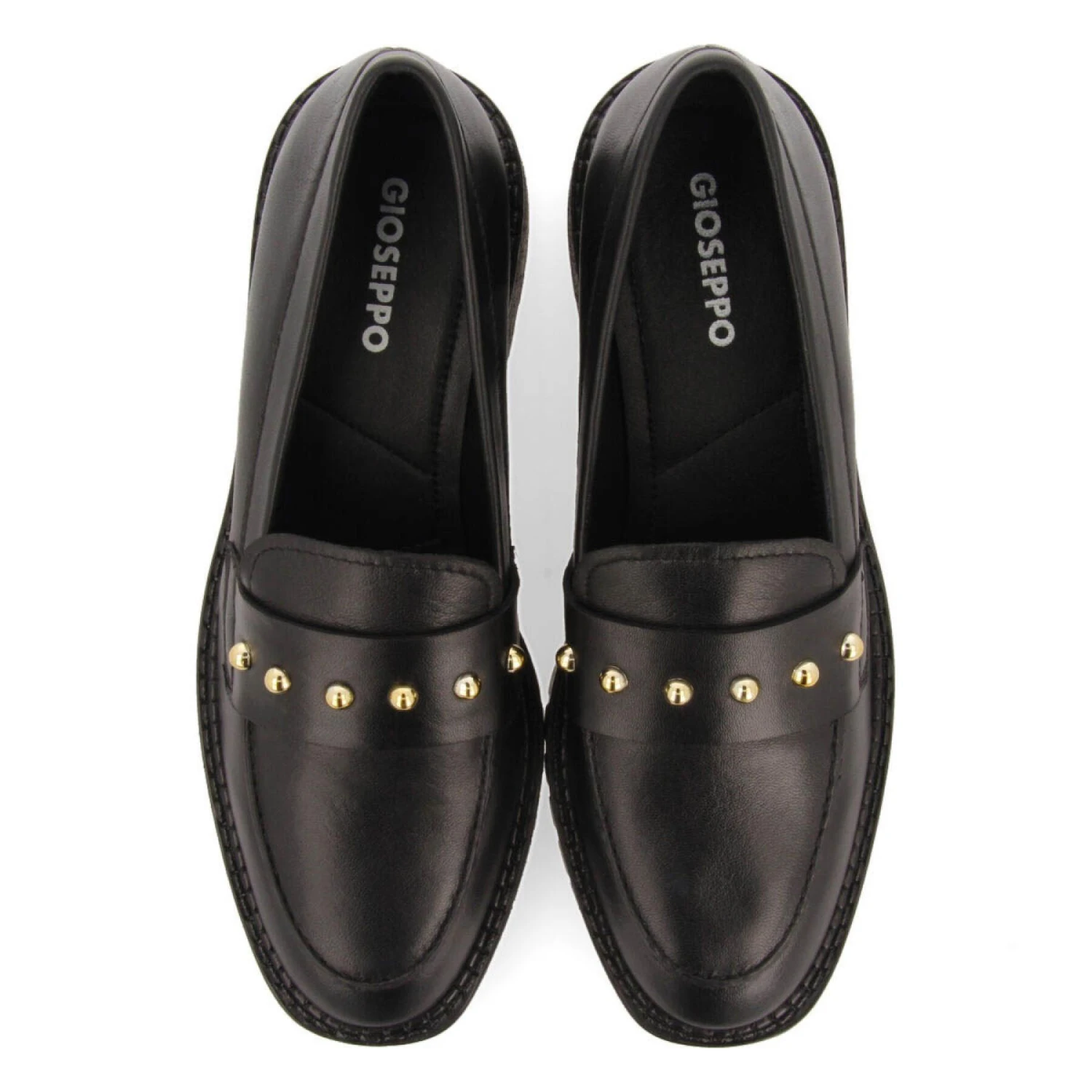 Ein Klassiker mit einer trendigen Note. Schwarze Mokassins aus Leder mit Nietendetails und Track-Sohle. Ausschnitt, Sohle und Futter aus gegerbtem Leder nach einem nachhaltigeren Gerbverfahren, das den Standards der Leather Working Group entspricht. Stark mit Latex gepolsterte Sohle, um einen höheren Tragekomfort zu gewährleisten. Die Sohle ist flexibel. Verpassen Sie nicht die neuen Mokassins aus der FW23-Kollektion von Gioseppo Woman.