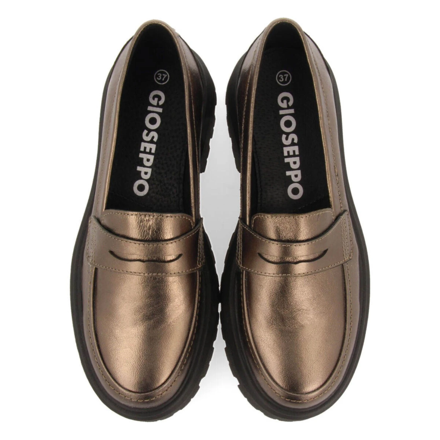 Metallisierte Mokassins aus bleifarbenem Leder. Dicke, trackähnliche Sohle. Sohle und Futter aus Leder, das nach einem nachhaltigeren Gerbverfahren gegerbt wurde, das den Standards der Leather Working Group entspricht. Stark mit Latex gepolsterte Sohle, um einen höheren Tragekomfort zu gewährleisten. Verpassen Sie nicht die neuen Mokassins aus der FW23-Kollektion von Gioseppo Woman.