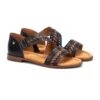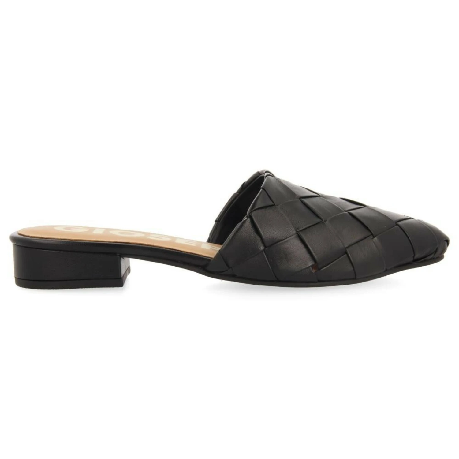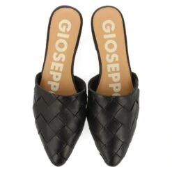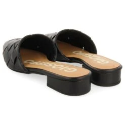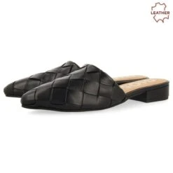 Babouches aus schwarzem, geflochtenem Leder mit offener Ferse. Mit Latex gepolsterte Innensohle aus Leder. Mini-Absatz von 2 cm. In dieses Modell werden Sie sich von der ersten Minute an verlieben.