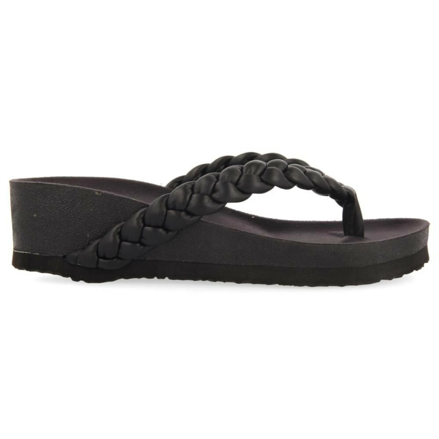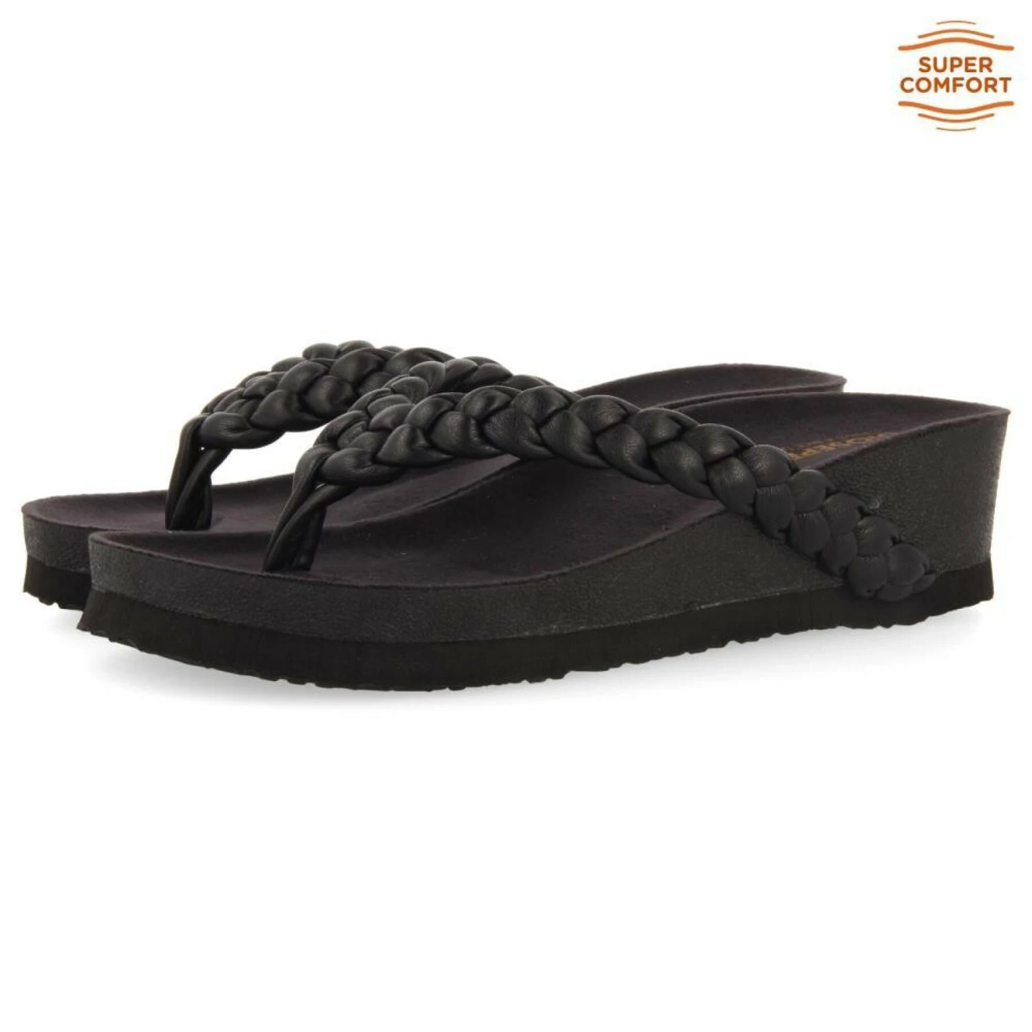 Schwarze, 6 cm hohe Keilsandaletten mit geflochtenen Riemchen. Weiche, anatomisch geformte Einlegesohle aus Mikrofaser. Die Sohle ist leicht. Sehr bequem und etwas ganz Besonderes!