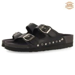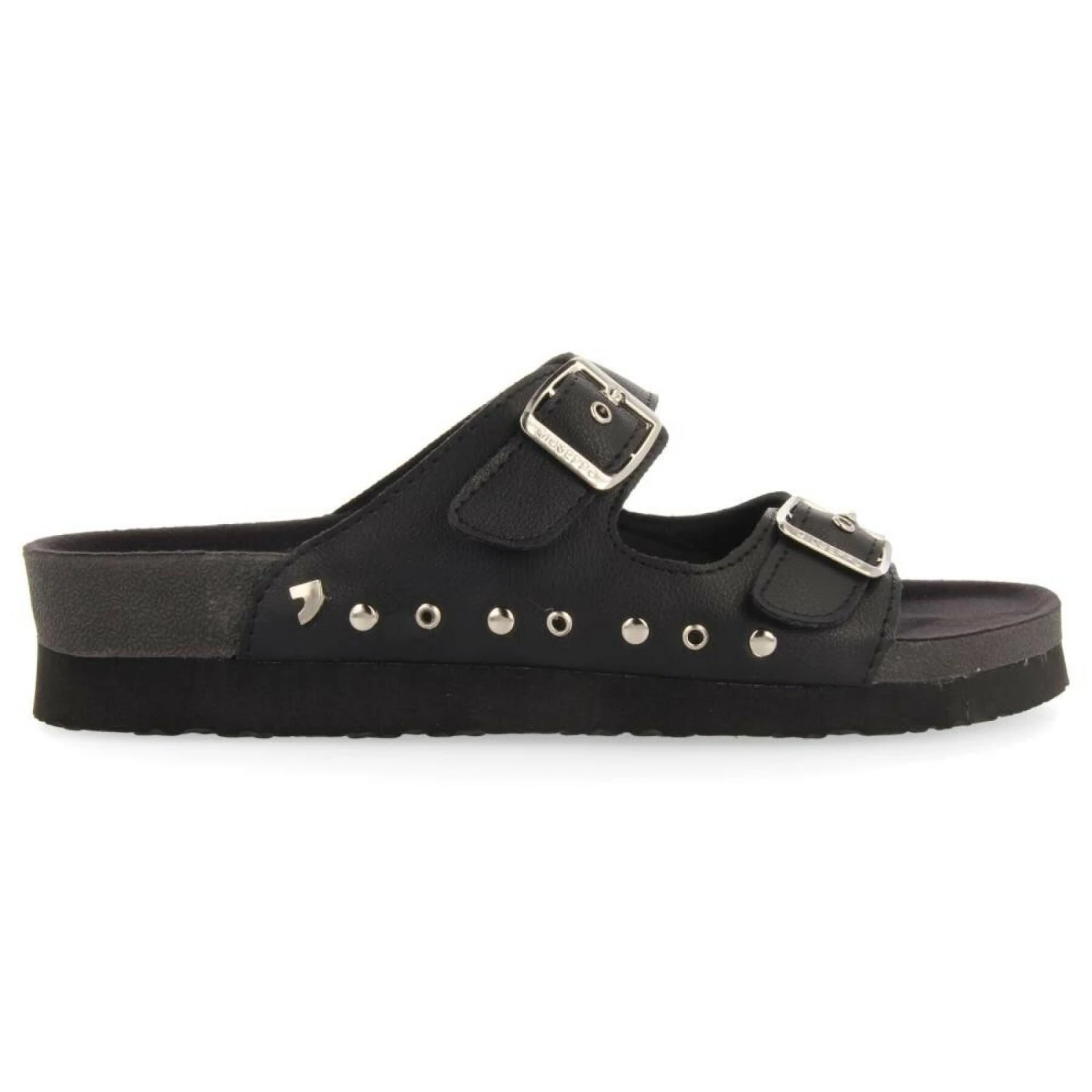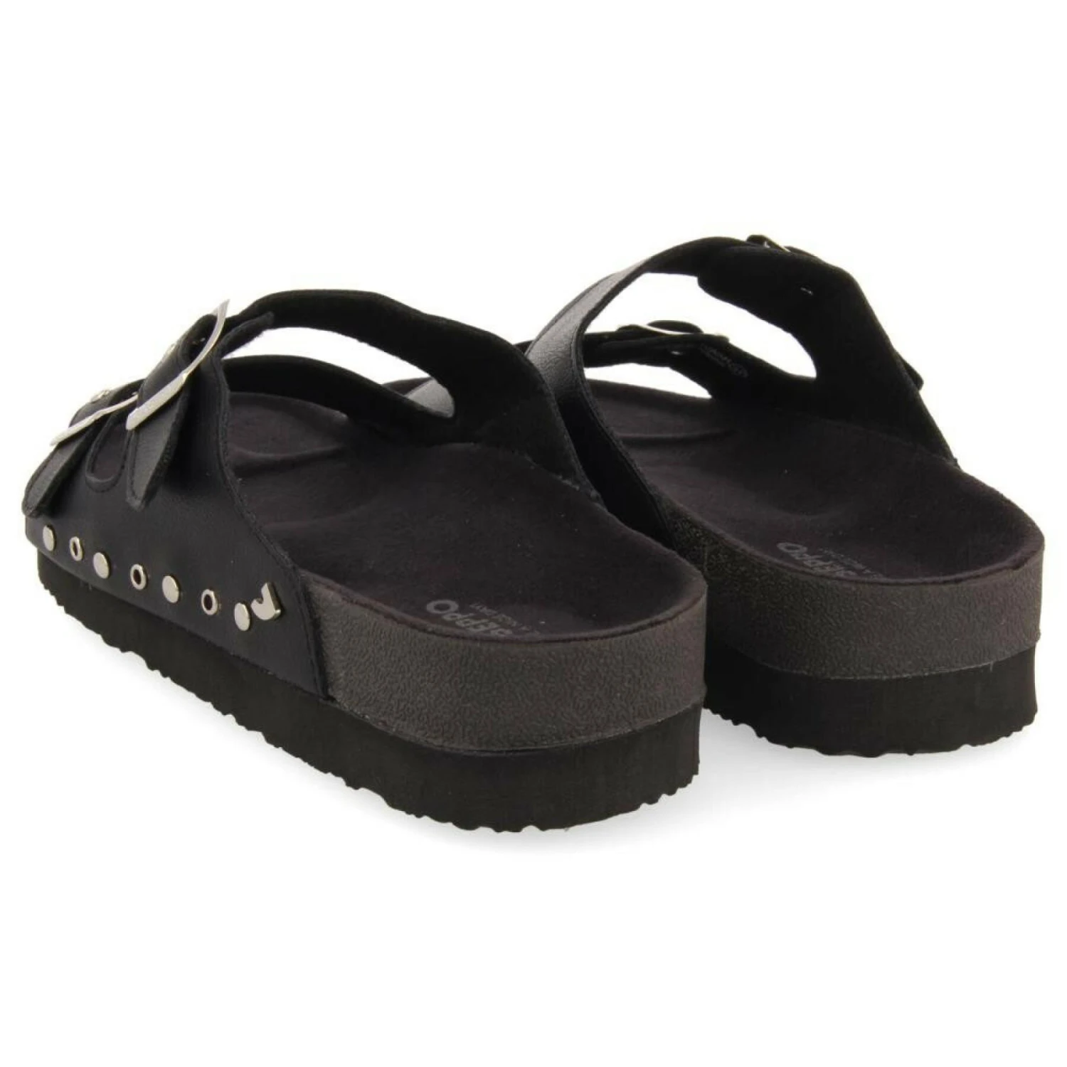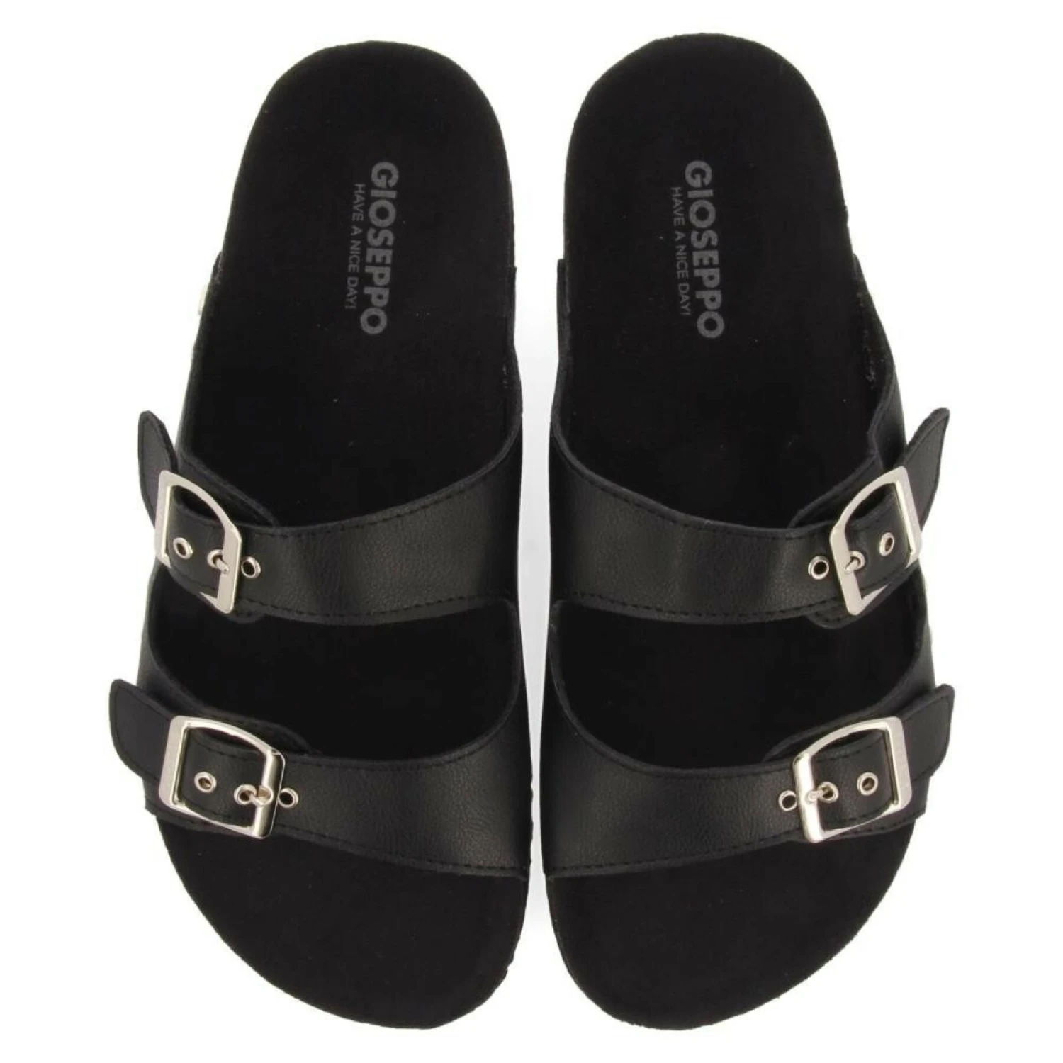 Schwarze Bio-Sandalen mit Nieten und Schnallendetails. Leichte doppelte Sohle. Weiche, anatomisch geformte Einlegesohle aus Mikrofaser. Leichte Sohle. Stil und Komfort an Strand- und Pooltagen mit der neuen Gioseppo-Kollektion.