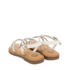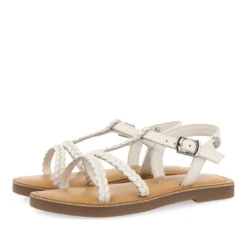Dies wird eines ihrer Lieblingsmodelle in diesem Sommer sein. Weiße Sandalen mit Flechtwerk und gepolsterter Innensohle aus Leder, die in Gerbereien nach einem nachhaltigeren Gerbverfahren gemäß den Standards der Leather Working Group (LWG) gegerbt wurden.