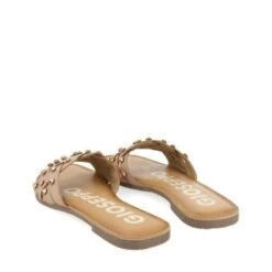 Pantoletten-Sandalen aus nudefarbenem Leder mit gekreuzten Riemchen und Strasssteinen. Einlegesohle aus Latex. Ledereinlegesohle gepolstert mit Latex, das in einem nachhaltigeren Verfahren nach den Standards der Leather Working Group gegerbt wurde. Sehr flexible Sohle für maximalen Komfort. Ein erneuerter Klassiker, der Sie von der ersten Minute an begeistern wird.