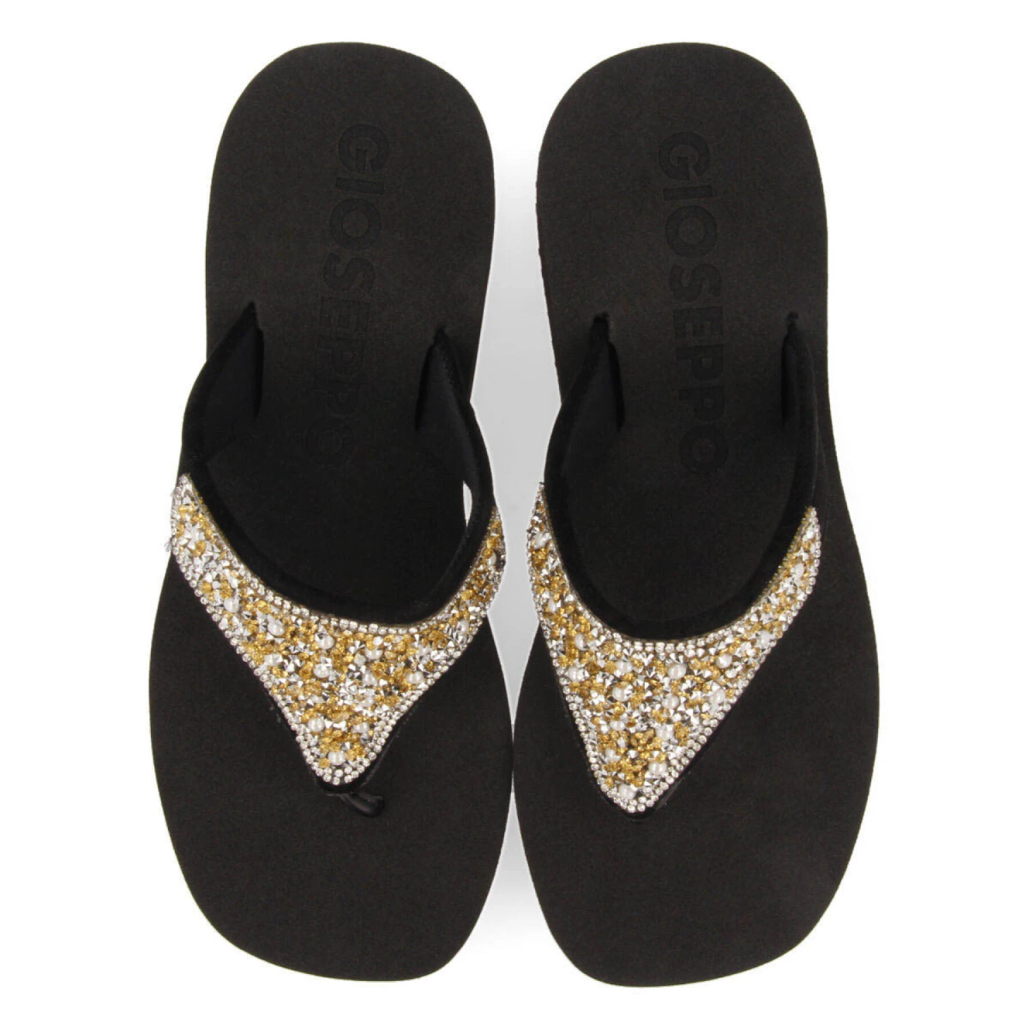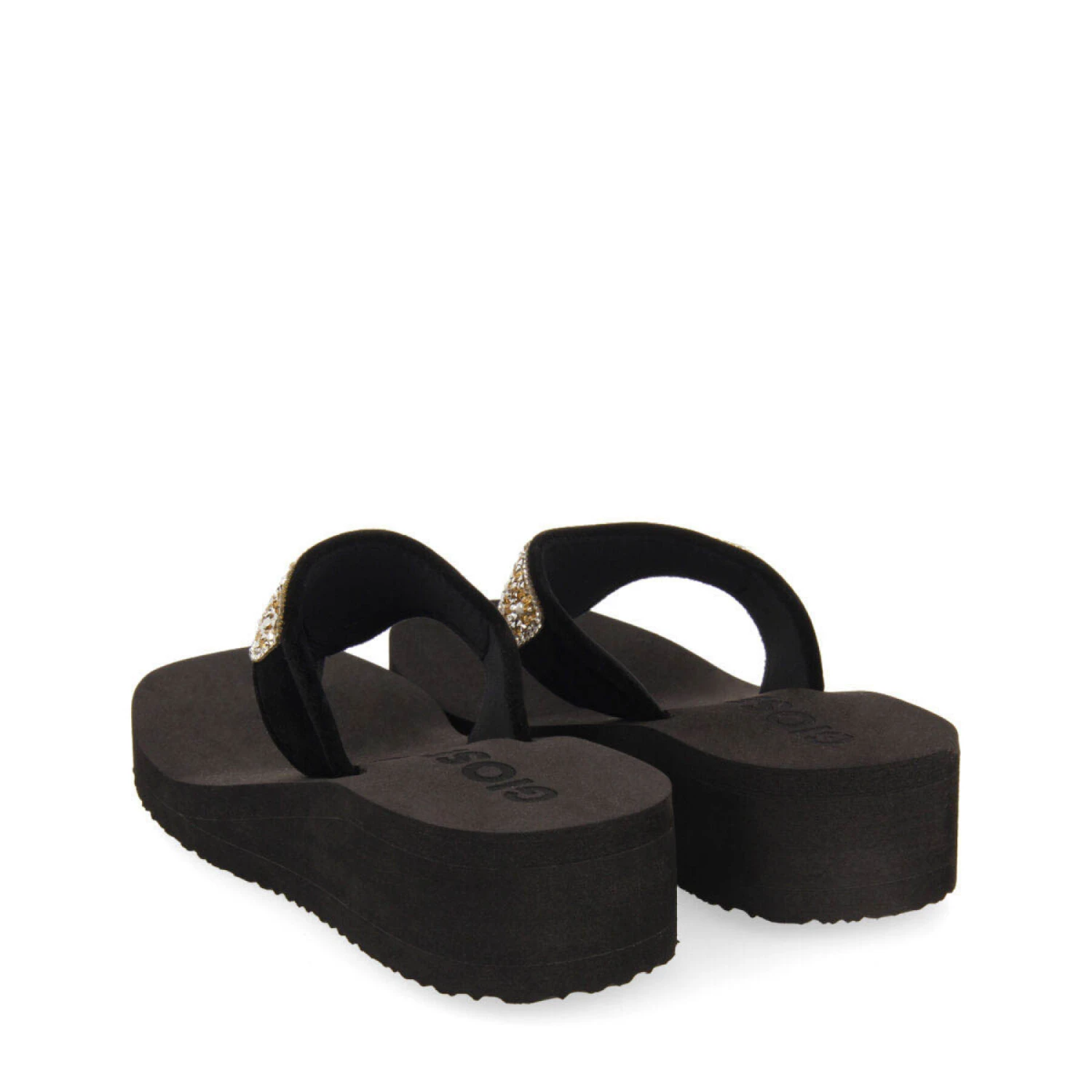 Schwarze Plateausandalen mit mehrfarbigen Ziersteinen auf den Riemchen. Weiche Einlegesohlen. Sehr leichte und flexible Sohlen. Sehr leicht und bequem!