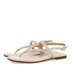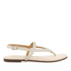 Suchen Sie nach einem Modell, das bequem und schick zugleich ist? Flache Off-White-Sandalen mit glitzernden Riemchen und verstellbarer Schnalle. Mit Latex gepolsterte Ledereinlegesohle für zusätzliche Dämpfung. Die Sohle ist flexibel. Einlegesohle aus Leder, das in Gerbereien nach einem nachhaltigeren Verfahren gegerbt wurde, das den Standards der Leather Working Group entspricht.