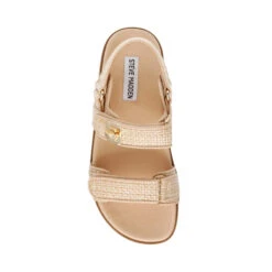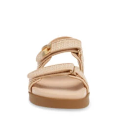Der MONA greift das klassische Design der Dreiriemensandale mit einem geformten Fußbett und einer flachen Sohle auf und wertet es mit substanziellen Accessoires in Goldton auf.